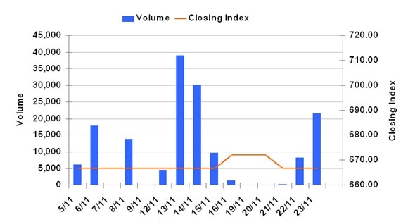 11月23日のCSXインデックスは前日比変わらずの666.67で取引を終えた。売買高は前日比約2.6倍の2万1500株、売買代金は同約2.6倍の1億3330万KHRだった。