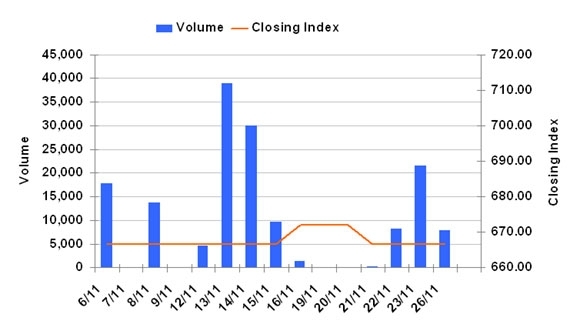 11月26日のCSXインデックスは先週末比変わらずの666.67で取引を終えた。売買高は先週末比▲63.3%減の7891株、売買代金は同▲63.3%減の4892万KHRだった。
