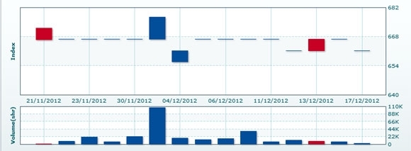 12月18日のCSXインデックスは前日比+5.38ポイント(0.81%)高の666.67で取引を終えた。売買高は前日比約4.2倍の1万1635株、売買代金は同約4.2倍の7207万KHRだった。