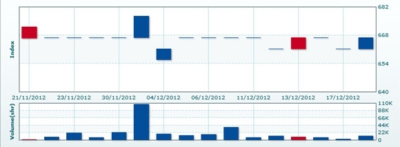 12月19日のCSXインデックスは前日比変わらずの666.67で取引を終えた。売買高は前日比+61.2%増の1万8750株、売買代金は同+61.3%増の1億1625万KHRだった。