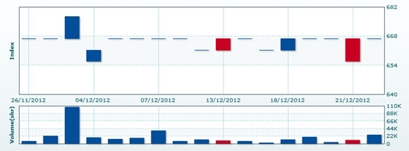 12月25日のCSXインデックスは前日比変わらずの666.67で取引を終えた。売買高は前日比▲57.3%減の1万0672株、売買代金は同▲57.3%減の6617万KHRだった。
