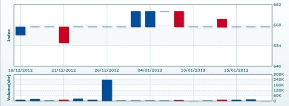 1月18日のCSXインデックスは前営業日比変わらずの666.67で取引を終えた。売買高は前営業日比▲34.5%減の8979株、売買代金は同▲34.5%減の5567万KHRだった。