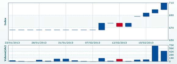2月20日のCSXインデックスは前日比+5.37ポイント(0.76%)高の715.05で取引を終えた。売買高は前日比▲60.0%減の1万8122株、売買代金は同▲59.4%減の1億2051万KHRだった。
