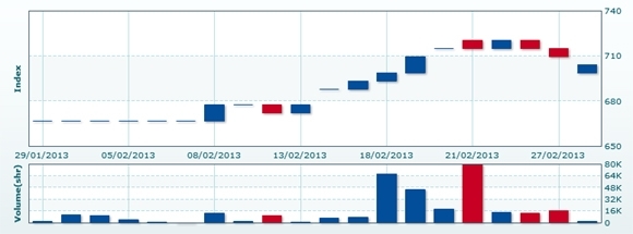 3月1日のCSXインデックスは前日比変わらずの704.30で取引を終えた。売買高は前日比+91.1%増の4000株、売買代金は同+91.3%増の2620万KHRだった。