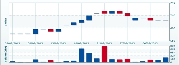 3月7日のCSXインデックスは前日比変わらずの698.92で取引を終えた。売買高は前日比▲23.9%減の1万7571株、売買代金は同▲23.5%減の1億1472万KHRだった。
