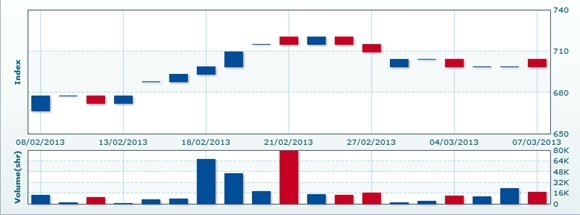 3月11日のCSXインデックスは先週末比+6.46ポイント(0.92%)高の705.38で取引を終えた。売買高は先週末比▲95.4%減の817株、売買代金は同▲95.4%減の531万KHRだった。