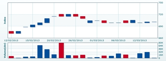 3月15日のCSXインデックスは前日比変わらずの701.08で取引を終えた。売買高は前日比▲28.1%減の354株、売買代金は同▲28.1%減の231万KHRだった。