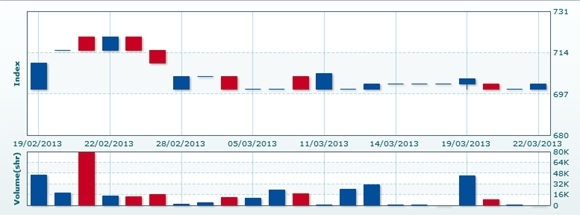 CSXインデックスは今週変わらずだった。火曜日から木曜日までの3営業日の売上高の合計は5万4078株、売買代金は3億5324万KHRだった。1営業日当たりの売買高は1万8026株、同じく売買代金は1億1775万KHRだった。