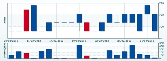 4月4日のCSXインデックスは前日比▲10.75ポイント(1.54%)安の688.17で取引を終えた。売買高は前日比+50.5%増の1万5571株、売買代金は同+47.3%増の9965万KHRだった。