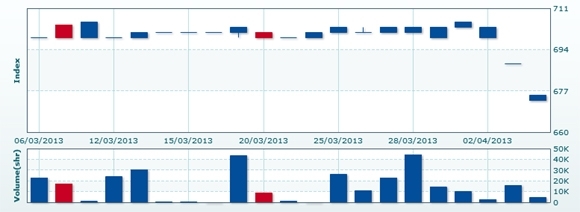 4月5日のCSXインデックスは前日比▲12.90ポイント(1.87%)安の675.27で取引を終えた。売買高は前日比▲72.1%減の4350株、売買代金は同▲72.7%減の2724万KHRだった。
