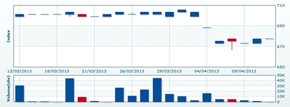 4月12日のCSXインデックスは前日比+23.66ポイント(3.49%)高の701.08で取引を終えた。売買高は前日比▲99.9%減の1株、売買代金は同▲99.9%減の6520KHRだった。