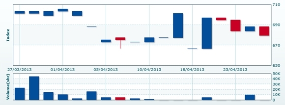4月26日のCSXインデックスは前営業日比▲2.15ポイント(0.31%)安の686.02で取引を終えた。売買高は前営業日比▲21.5%減の7649株、売買代金は同▲23.7%減の4763万KHRだった。