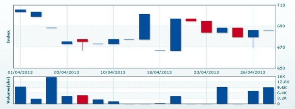 4月29日のCSXインデックスは先週末比変わらずの686.02で取引を終えた。売買高は先週末比+23.5%増の9449株、売買代金は同+26.6%増の6028万KHRだった。