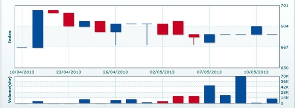 5月17日のCSXインデックスは前日比変わらずの677.42で取引を終えた。売買高は前日比▲16.4%減の9141株、売買代金は同▲16.4%減の5758万KHRだった。