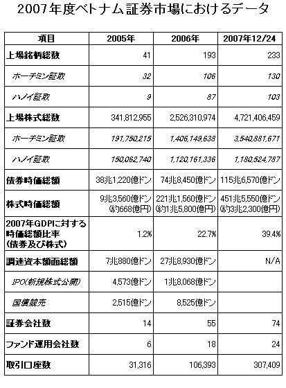 今年の市場には多くの変動が見られた。2006年12月14日を起点として振り返ってみた場合、成長率は概ね順調だったと言えるだろう。2007年12月14日にVNインデックスは922.09ポイントに達し、前年同期比23%上昇した。また HASTCインデックスは324.88ポイントに達し、同比32%上昇した。国家証券委員会のブー・バン会長は、時価総額に対する売買代金の比率を計算すれば、ベトナム証券市場の活発さが世界の先進国の証券市場に負けていないことが分かる、とコメントしている。