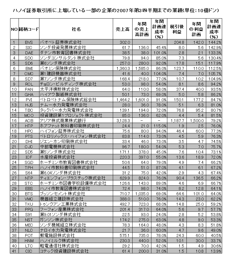 ホーチミン証券取引所及びハノイ証券取引所に上場している企業の50%以上が2007年第3四半期の業績を発表した。最近の専門家の分析によれば、2007年末の市況は、上場企業の第3四半期の業績、及び市場の需給によって決められるという。実際には市場の需給は高いレベルで維持され、年末にかけて増加していくと予想されている。上場企業の第3四半期業績も好業績を発表しているところが多い。