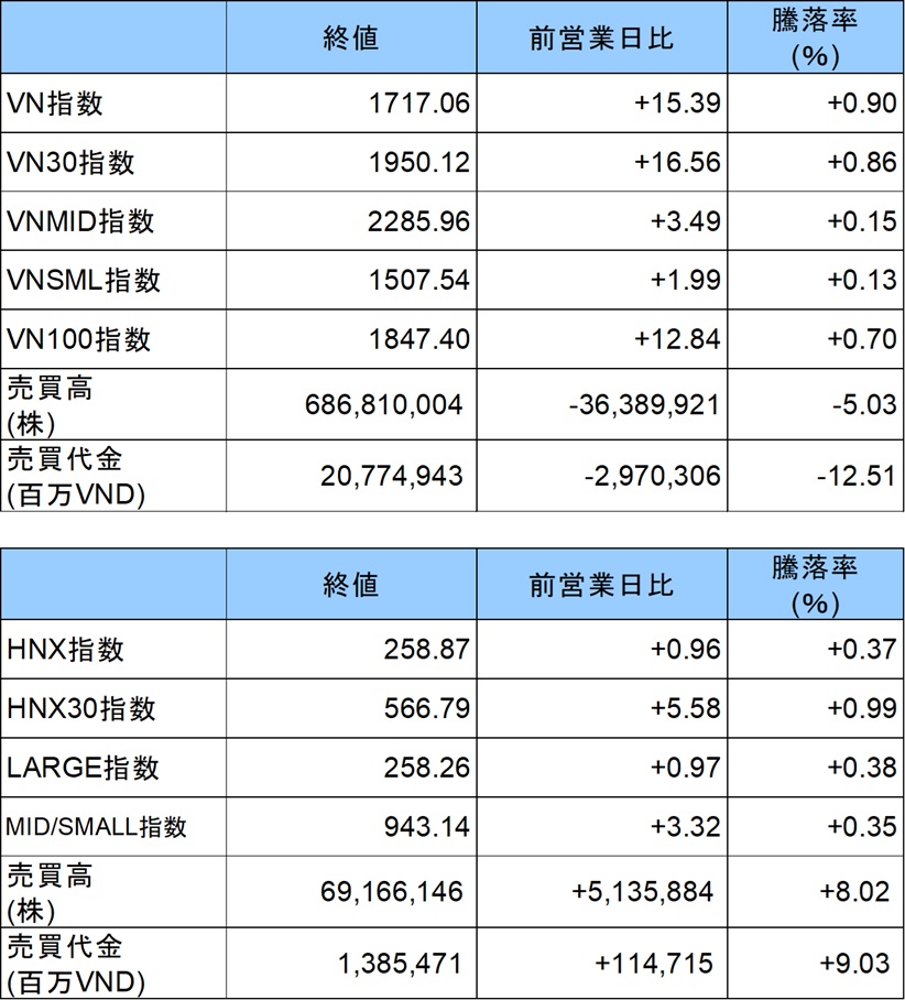 売買代金は20兆7749億VND(約1230億円)、前日比▲1.3%減少した。主力株は値上がりがり銘柄が多く、インデックスをけん引した。