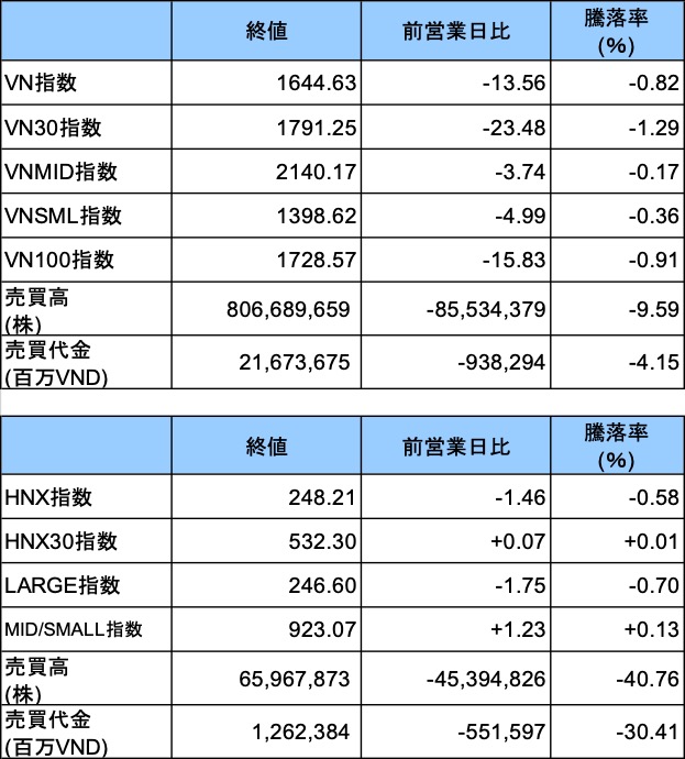 ホーチミン証券取引所(HSX)では、VNインデックスが前日比▲13.56ポイント(▲0.82%)下落の1644.63ポイントで引けた。売買代金は約21兆6737億VND(約1300億円)と低水準にとどまった。