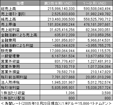 アンザン省水産輸出入株式会社(アジフィッシュ、AGIFISH)[銘柄コード:AGF]はこのほど、2005年第3四半期の業績を発表した。詳細は次の通り: