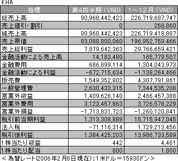 カインホイ株式会社(カホメックス、KHAHOMEX)[銘柄コード:KHA]はこのほど、2005年第4四半期の業績を発表した。詳細は次の通り: