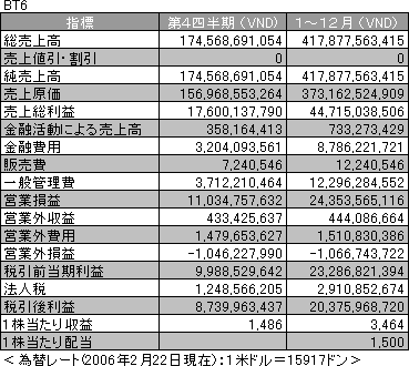 ベトナム株情報 > ベト株ニュース > ホーチミン証取 > BT6:2005年第4四半期業績発表
