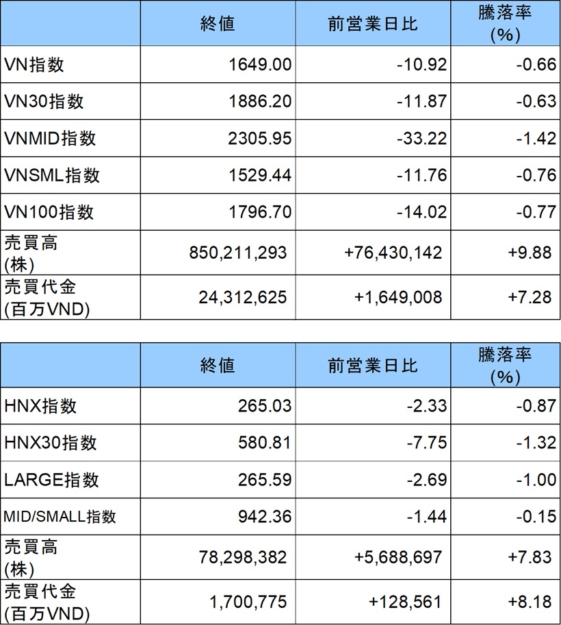 売買代金は24兆3126億VND(約1430円)、前日比+7.3%増加した。主力株は値下がり銘柄が多く、インデックスの重しになった。