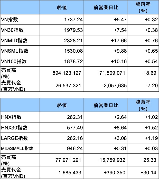 売買代金は1兆6854億VND(約99億円)、前日比+30.1%増加した。主力株は値上がり銘柄が多く、インデックスをけん引した。