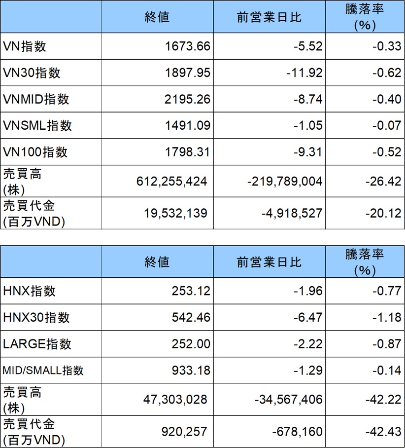 売買代金は19兆5321億VND(約1145億円)、前日比▲20.1%減少した。主力株は値下がり銘柄が多く、インデックスの重しになった。