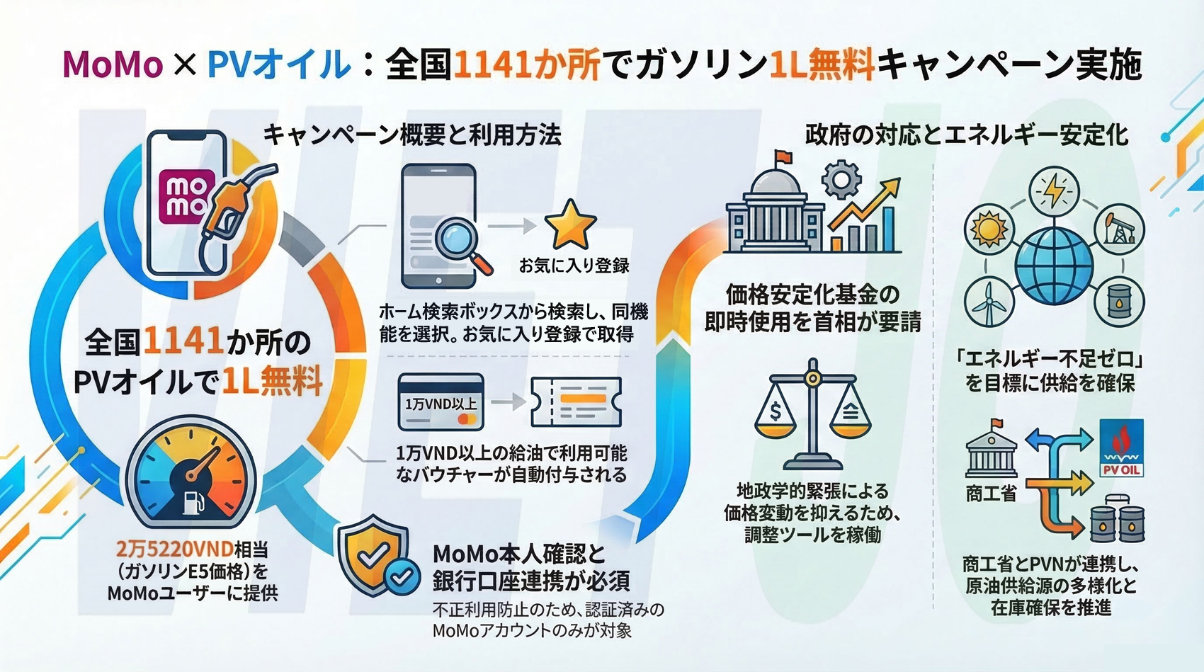 今回のキャンペーンは、中東の地政学的緊張により世界のエネルギー市場が引き続き影響を受ける中、ファム・ミン・チン首相が価格変動をコントロールするため、ガソリン価格安定化基金の即時使用を要請したことを背景に実施されるもの。