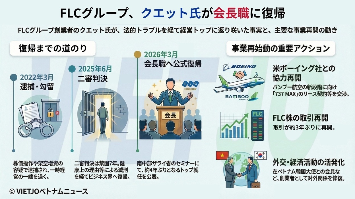 クエット氏は詐欺事件の裁判を経て出所以降、FLCや同社傘下のバンブー航空(Bamboo Airways)のイベントに継続的に出席してきたが、その際は主に創業者として紹介されていた。