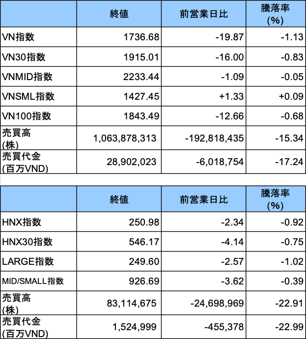 ホーチミン証券取引所(HSX)のVNインデックスは、前日比▲19.87ポイント(▲1.13%)下落し、1736.68ポイントで引けた。HSXの売買代金は前日比▲17.2%減少の28兆9020億VND(約1740億円)となった。ハノイ証券取引所(HNX)のHNXインデックスは、前日比▲2.34ポイント(▲0.92%)下落し、250.98ポイントで取引を終えた。HNXの売買代金は前日比▲23.0%減少の1兆5249億VND(約92億円)だった。