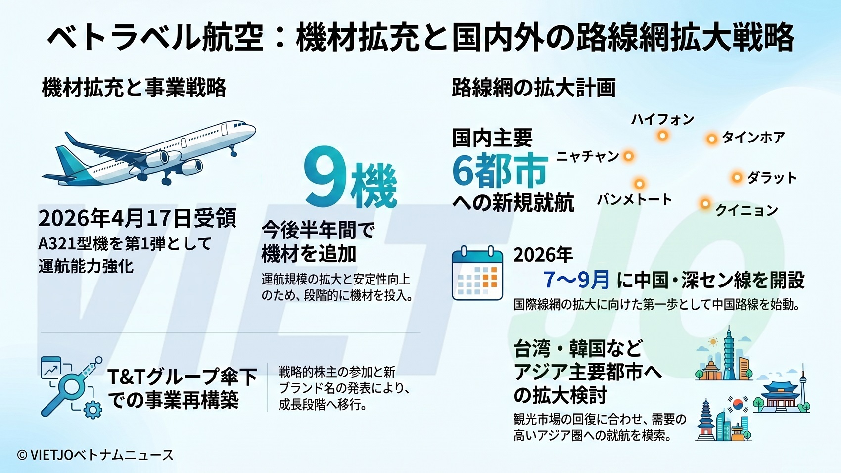 同社は現在、地場系コングロマリット(複合企業)T&Tグループ(T&T Group)のエコシステム内で事業の再構築を進めており、戦略的株主の参加によって運航規模の拡大や安定性の向上を図っている。