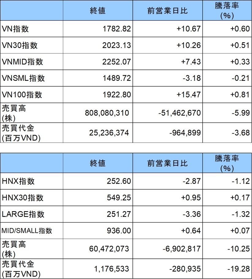 売買代金は25兆2364億VND(約1500億円)、前日比▲3.7%減少した。主力株は値上がり銘柄が多く、インデックスをけん引した。