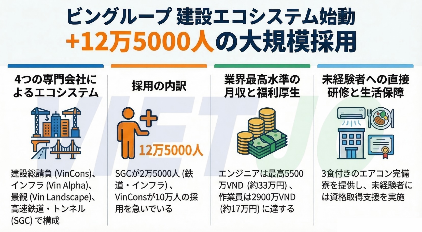 待遇面は非常に魅力的で、月収はエンジニアが3000万~5500万VND(約18万2000~33万円)、建設作業員が2200万~2900万VND(約13万3000~17万6000円)、運転手やオペレーターが1600万~6500万VND(約9万7000~39万円)となっている。