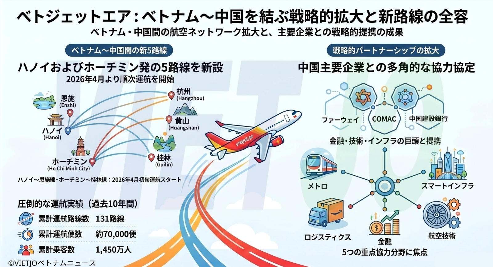 トー・ラム書記長 兼 国家主席の中国公式訪問に合わせ、地場系コングロマリット(複合企業)のソビコ・グループ(SOVICO Group)および国内最大手の格安航空会社(LCC)ベトジェットエア[VJC](Vietjet Air)は16日、中国・北京で投資協力会議を開催した。ベトジェットエアはこの席で、ベトナムと中国を結ぶ新たな5路線を発表した。