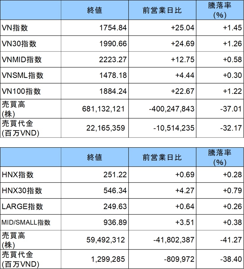 売買代金は22兆1654億VND(約1320億円)、前日比▲32.2%減少した。主力株は値上がり銘柄が多く、インデックスをけん引した。