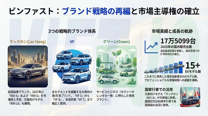 今回再編された3ブランドはそれぞれ異なる位置づけを持つ。「ラックホン」はベトナム民族の誇りを象徴する超高級車ブランド、「VF」は「VF 3」から「VF 9」や7人乗りの多目的車(MPV)「VF 7」まで全セグメントを網羅する大衆向け乗用車ブランド、「グリーン(Green)」はサービスビジネス向けブランドだ。
