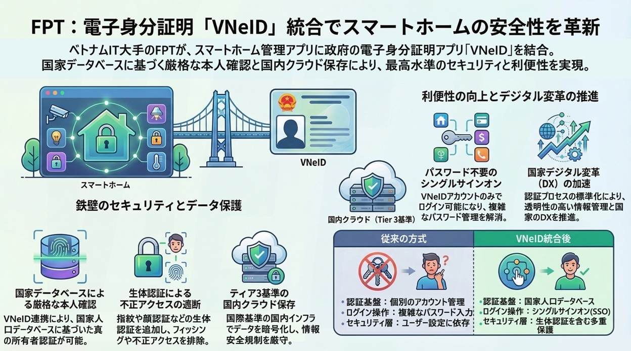 ベトナムのIT最大手FPT情報通信[FPT](FPT Corporation)傘下のFPTテレコム[FOX](FPT Telecom)はこのほど、自社のスマートホームエコシステムを管理するアプリ「FPTライフ(FPT Life)」に、電子身分証明アプリ「VNeID」によるログイン機能を統合した。これにより、カメラデータのセキュリティが向上し、アクセスが簡素化される。