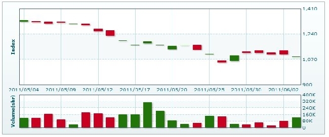 6月3日のラオス総合指数は18.10ポイント(1.64%) 下落し、1087.88で取引を終えた。売買高は前日比46.1%増の12万2632株、売買代金は同16.9%増の7億1574万キープだった。