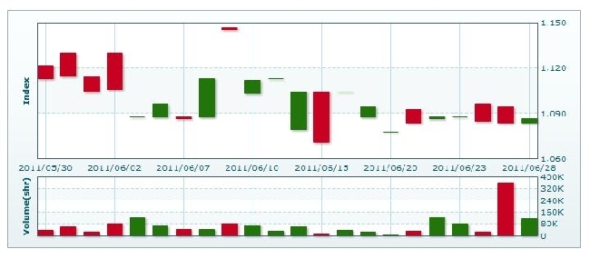 6月28日のラオス総合指数は2.64ポイント(0.24%) 上昇し、1086.56で取引を終えた。売買高は前日比67.9%減の11万5574株、売買代金は同75.8%減の6億9339万キープだった。
