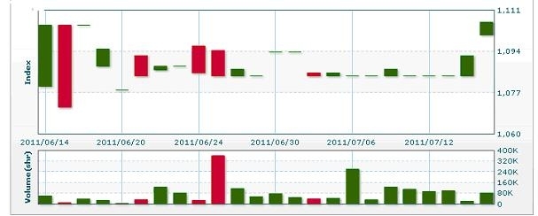 7月15日のラオス総合指数は13.67ポイント(1.25%)上昇し、1105.98で取引を終えた。売買高は前日比267.8%増の8万4596株、売買代金は同424.6%増の6億3354万キープだった。