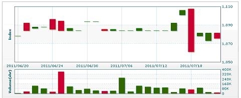 7月21日のラオス総合指数はは5.75ポイント(0.53%) 下落し、1075.53で取引を終えた。売買高は前日比26.52%減の1万6900株、売買代金は同26.71%減の8927万キープだった。