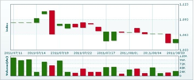 8月10日のラオス総合指数は5.28ポイント(0.50%)下落し、1046.02で取引を終えた。売買高は前日比154.5%増の7万0819株、売買代金は同81.82%増の3億7225万キープだった。