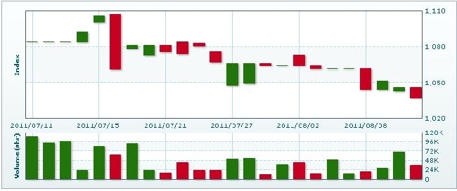 8月11日のラオス総合指数は8.39ポイント(0.80%)下落し、1037.63で取引を終えた。売買高は前日比49.4%減の3万5854株、売買代金は同47.98%減の1億9365万キープだった。