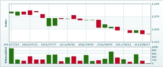 8月19日のラオス総合指数は1.32ポイント(0.13%)下落し、1027.92で取引を終えた。売買高は前日比233%増の5000株、売買代金は同315.7%増の3575万キープだった。