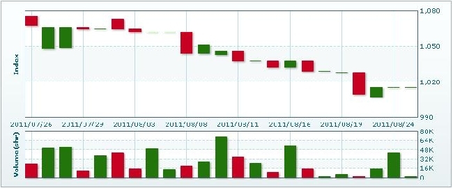 LSX総合指数は今週12.35ポイント下落した。月曜日から金曜日まで5営業日を合計した売買高は12万1488株、売買代金は6億2927万キープだった。1業日当たりの売買高は2万4297株、1業日当たりの売買代金は1億2585万キープだった。