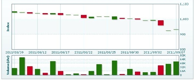9月8日のラオス総合指数は25.17 ポイント(2.70%)上昇し、956.82で取引を終えた。売買高は前日比1.2%減の5万4391株、売買代金は同14.7%増の3億0397万キープだった。