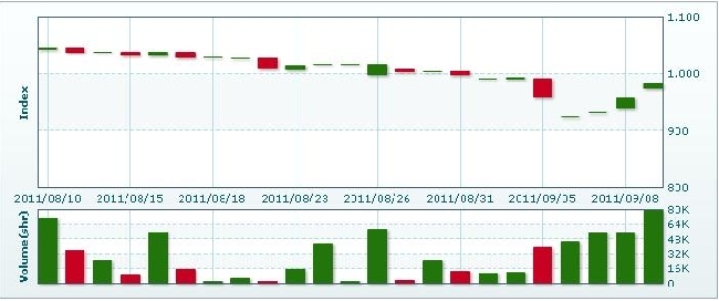 9月9日のラオス総合指数は25.18 ポイント(2.63%)上昇し、982で取引を終えた。売買高は前日比45.2%増の7万8984株、売買代金は同44.5%増の4億3936万キープだった。