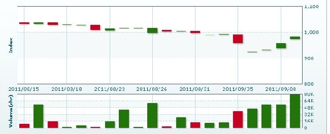 9月12日のラオス総合指数は13.67 ポイント(1.39%)上昇し、995.67で取引を終えた。売買高は先週末比22.9%減の6万0858株、売買代金は同17.1%減の3億6412万キープだった。