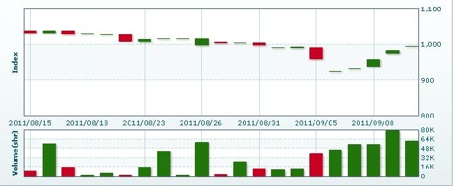 9月13日のラオス総合指数は8.39ポイント(0.84%)下落し、987.28で取引を終えた。売買高は前日比44.5%減の3万3757株、売買代金は同43.8%減の2億0460万キープだった。